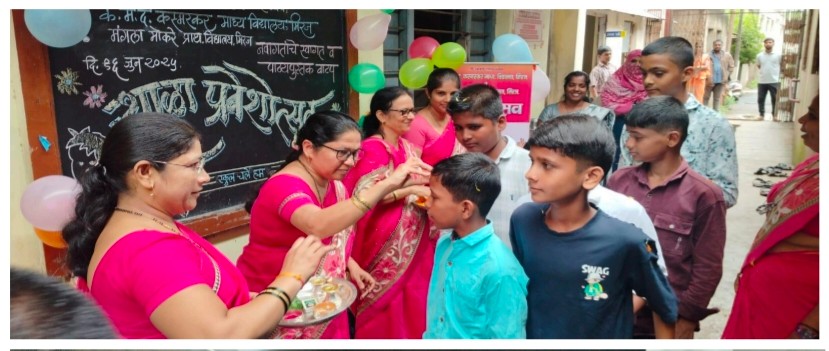 शाळेच्या माननीय मुख्याध्यापिका सौ काळे मॅडम यांनी नवीन प्रवेश घेतलेल्या विद्यार्थ्यांचे पुष्पगुच्छ व पाठ्यपुस्तक देऊन स्वागत केले. या प्रवेशोत्सवप्रसंगी विद्यालयाच्या प्रवेशद्वारा जवळ आकर्षक अशी रांगोळी काढण्यात आली होती तसेच विविध रंगाचे फुगे लावून विद्यार्थी स्वागतासाठी सुशोभीकरण करण्यात आले होते.