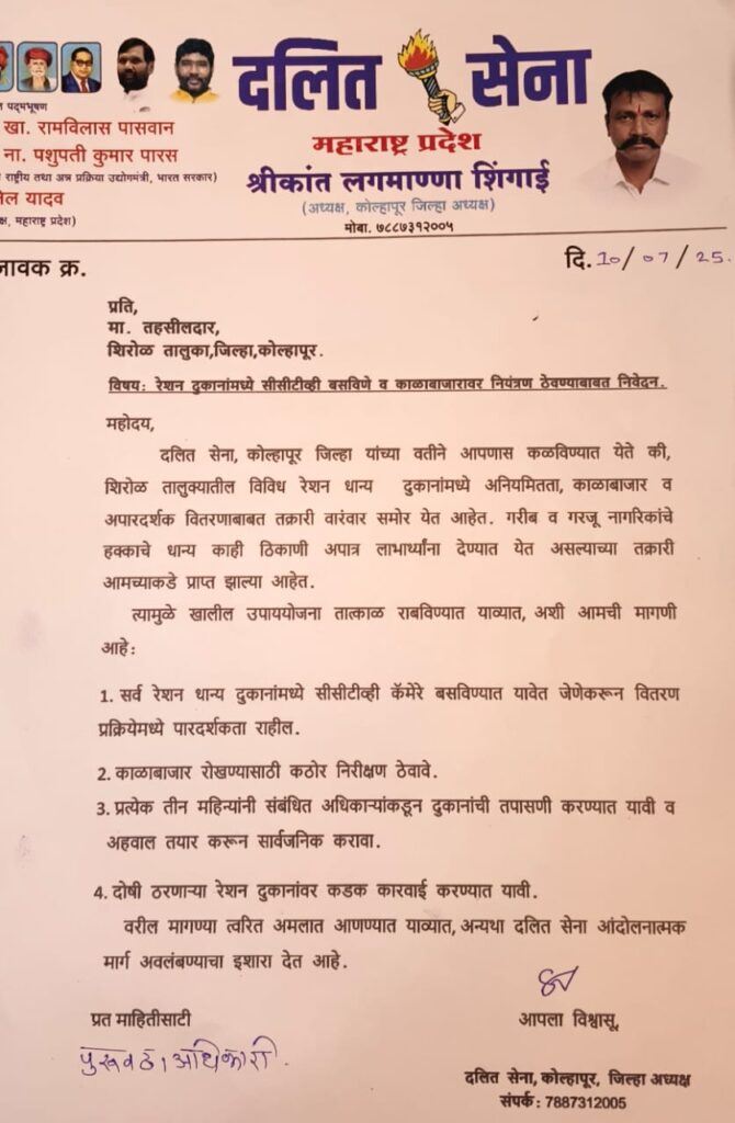 शिरोळ तालुक्यातील विविध रेशन धान्य दुकानांमध्ये अनियमितता, काळाबाजार व अपारदर्शक वितरणाबाबत तक्रारी वारंवार समोर येत आहेत. गरीब व गरजू नागरिकांचे हक्काचे धान्य काही ठिकाणी अपात्र लाभार्थ्यांना देण्यात येत असल्याच्या तक्रारी दिसून येत आहेत,